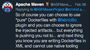 As you might know, one of my Open Source babies is the one and only fabric8io/docker-maven-plugin (d-m-p). If you already use this Maven plugin, you know, that it is super powerful and flexible to configure. This flexibility comes at a price so that the configuration can become quite complicated. Now, if you only want to build Docker images with Maven, I have good news: Since 0.25.1 d-m-p supports a zero XML configuration mode, the so-called Simple Dockerfile Build mode.